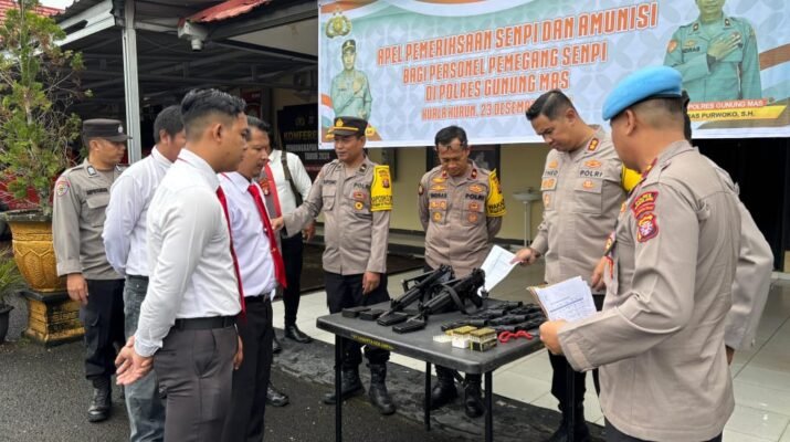 Kuala Kurun – Kapolres Gunung Mas, AKBP Theodorus Priyo Santosa, S.I.K., memimpin langsung pengawasan dan pemeriksaan senjata api dinas yang dipegang oleh personel Polres